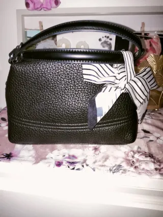 Elegante bolso negro con un detalle de pañuelo a rayas. - Textura granulada. - Asa superior. - Cierre de cremallera. Está nuevo sin utilizar,se vende por necesitar espacio