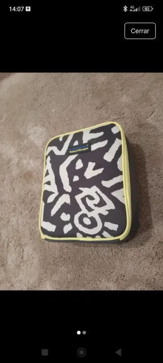 Neceser o porta alimentos de la marca Rip Curl original y espacioso con un diseño llamativo. - Estampado de rayas blancas y negras. - Ribete de color amarillo. - Cierre de cremallera.