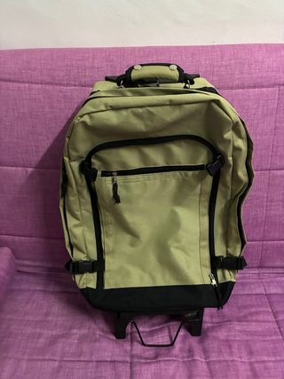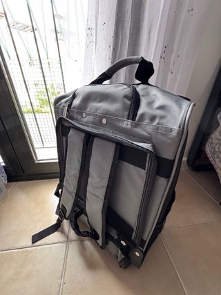 Maleta de viaje formato mochila y mochila de cabina. - Compartimento principal espacioso. - Bolsillo frontal con cremallera. - Asas acolchadas y ajustables. - Ruedas y asa extensible para facilitar el transporte.