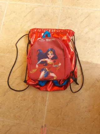 Mochila infantil con diseño de Wonder Woman de Warner Bros. - Color rojo brillante. - Cierre de cordón. - Asa superior. - Diseño frontal de Wonder Woman. Con capa roja, Block y lápices sin estrenar todo
