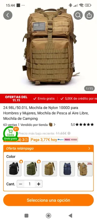Mochila de estilo militar con una capacidad de 45 litros. Perfecta para actividades al aire libre o uso diario. - Diseño táctico con múltiples compartimentos. - Cierre de cremallera. - Incluye parche de la bandera de España.