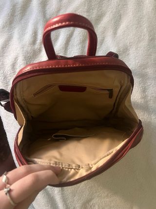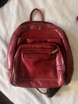 Mochila o bolso pequeño en tono rojizo, con un diseño práctico y moderno. - Material: Piel sintética. - Color: Rojo. - Cierre principal con cremallera. - Bolsillo frontal con cremallera. - Asa superior y correas ajustables.