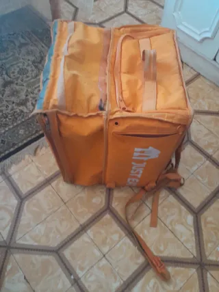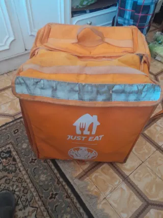 Mochila de reparto de comida de la marca Just Eat. - Color naranja y azul. - Compartimentos amplios para mantener la comida caliente. - Correas ajustables para mayor comodidad.