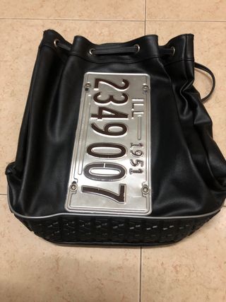 Mochila de cuero con un diseño inspirado en el estilo motero. Cuenta con un detalle frontal de matrícula. - Material: Cuero - Color: Negro - Cierre: Cordón - Detalle: Matrícula decorativa ILL 234907 1951 metal