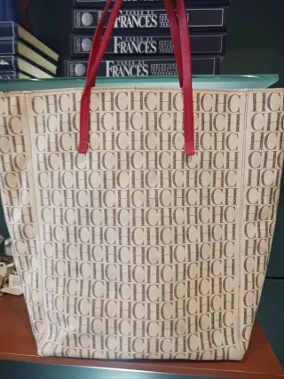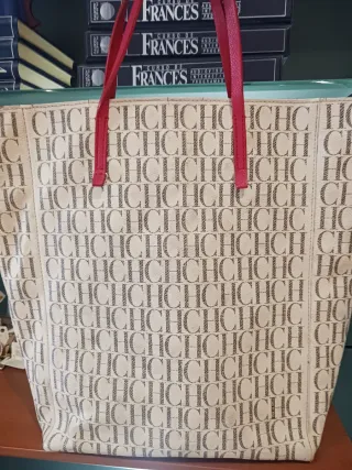 Bolso de mano con estampado CH. - Diseño con monograma. - Asas en color rojo. - Combinación de beige y rojo.