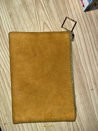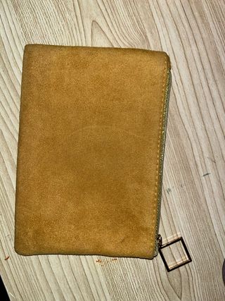 Bolso de mano pequeño en color mostaza, con un acabado aterciopelado. - Cierre de cremallera. - Detalle de tirador metálico cuadrado.