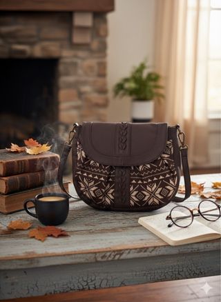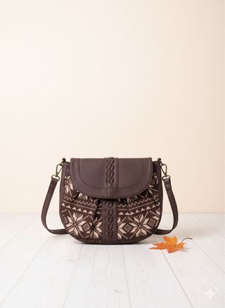 Bolso de hombro con un diseño único. - Color principal marrón. - Panel frontal con estampado de estilo nórdico en beige y marrón de punto. - Detalle de trenzado en la solapa y en el centro del panel frontal. - Correa ajustable para llevar al hombro. - 21x 25