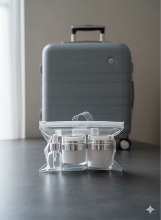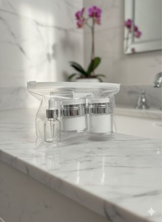 Set de botes rellenables con sistema al vacío para llevar tus productos de cuidado personal de viaje. Incluye un bote con cuentagotas, dos botes con tapa y bote de contorno de ojos. - Bote con cuentagotas. - Dos botes con tapa. - Bote contorno de ojos - Material transparente.