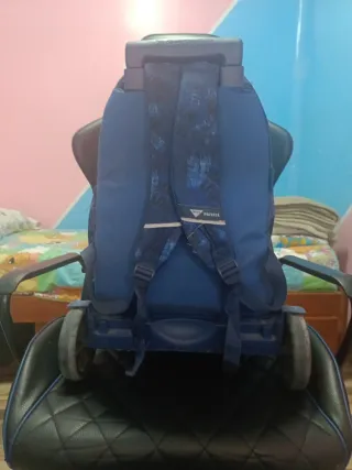 Mochila azul con diseño estampado y ruedas. - Compartimento principal espacioso. - Bolsillo frontal con cremallera. - Tirantes acolchados ajustables. - Base reforzada para mayor durabilidad.