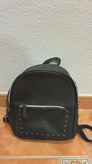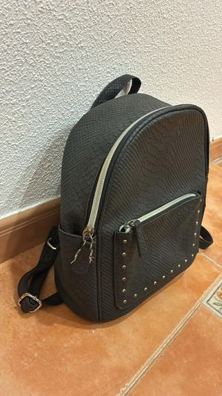 Mochila con un diseño moderno y llamativo. - Acabado texturizado tipo piel de serpiente. - Bolsillo frontal con tachuelas metálicas. - Cierre principal con cremallera. - Correas ajustables.