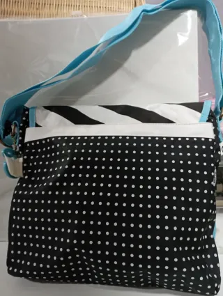 Bolso bandolera con un diseño llamativo y moderno. - Estampado de rayas blancas y negras. - Detalle de figura femenina. - Base y ribete en color azul claro. - Cierre con botones dorados.Nuevo 🏷 Por culpa de personas maliciosas🤬 (sí, incluso estafadores organizados que se ven por Wallapop, etc...), no acepto devoluciones🚫, para evitar malentendidos. Envío en 24/48 horas (de L a V)🚛 Precio no negociable 🤝⛔ Cualquier duda por mensaje privado ❓✉️