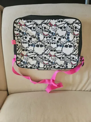 Práctica bolsa para portátil con un divertido diseño. - Estampado de calaveras y lazos. - Correa ajustable para llevar al hombro.