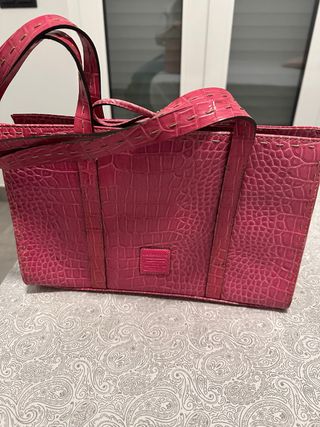Elegante bolso con textura de cocodrilo en un vibrante color rosa fucsia. - Diseño estructurado. - Asas cómodas para llevar al hombro o en la mano. - Detalle de costuras visibles. - Placa de marca en la parte frontal. - Espejo, tarjetero y monedero incluidos