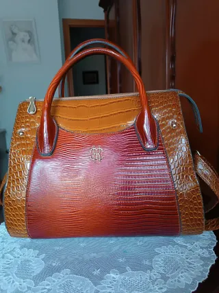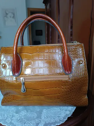 Elegante bolso de mano grande para mujer, con un diseño sofisticado y moderno. - Combinación de texturas imitación piel de cocodrilo y escamas. - Asas de mano y correa para hombro. - Detalle metálico con logo en la parte frontal.lleva bastante bolsillos en el interior, nunca se ha estrenado
