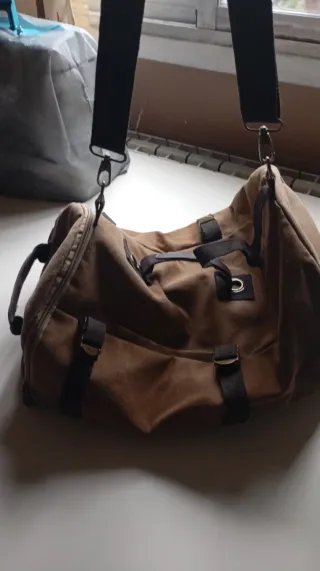 Portatrajes de viaje con un diseño elegante y práctico. - Combinación de materiales en negro y marrón. - Asas de mano cómodas. - Compartimento principal con cremallera.