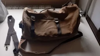 Bolso tipo mochila de cuero con un diseño clásico y práctico. - Material: Cuero - Color: Negro y marrón - Compartimento principal con cierre de cordón. - Bolsillos frontales con solapa y hebilla. - Asa superior. - Correas ajustables para llevar en la espalda. - Le falta un cierre a un bolsillo pero se puede reponer