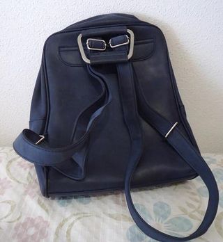Mochila muy elegante color azul, como de piel, tiene peso. Varios compartimentos y bolsillos, ajustable. Practicamente sin uso, como nueva