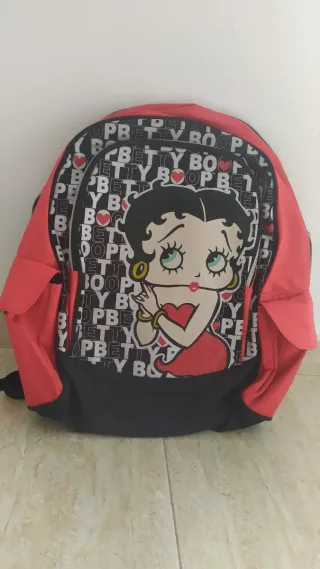Mochila con diseño de Betty Boop, ideal para el día a día. - Estampado frontal de Betty Boop. - Patrón repetido de Betty Boop en blanco y negro. Dos compartimientos y dos bolsillos laterales.