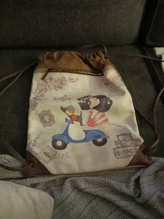 Práctica bolsa o mochila con un diseño encantador. - Estampado de chica en scooter y flores. - Cierre de cremallera superior. - Bolsillo exterior con cremallera. - Ribetes y cordones en tono marrón.