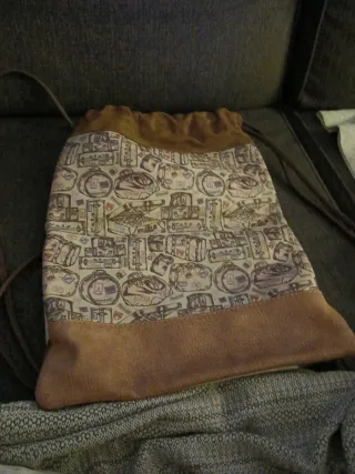 Mochila de tela con detalles en marrón y cuerdas. - Diseño con texto California y nombres de ciudades. - Cierre de cordón con borlas. - Asa de cuerda. - Base reforzada en color marrón. Se ha usado. Pequeño despiste se ve en foto que se puede lavar