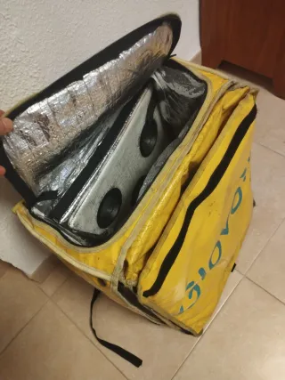 Mochila térmica de Glovo, ideal para repartos. Se encuentra en perfecto estado, como si fuera a estrenar. - Diseño práctico y funcional. - Combinación de colores amarillo y gris.