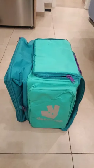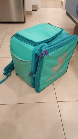 Mochila de reparto de la marca Deliveroo, ideal para mensajeros. - Diseño espacioso y funcional. - Cremalleras de color morado. - Bolsillo lateral de malla.