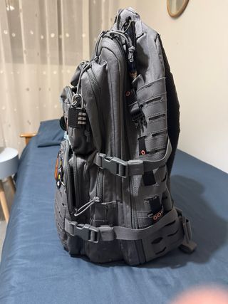 Mochila de estilo militar en color negro. Super resistente y con gran capacidad de almacenaje. Vas a alucinar con lo que cabe dentro. ¡Parches incluidos de la bandeja de España y el de "A llorar a la llorería! 👏🏻😁 Éstos y otros parches se pueden quitar y poner cuando se quiera ya que tiene toda la zona superior de velcro. Cuenta con varios compartimentos y correas para organizar tus cosas. - Compartimento principal espacioso, pudiendose abrir en 180 grados para que puedas abrir por completo la mochila y te permita organizarla más fácilmente. - Bolsillo frontal con cierre de cremallera. - Correas ajustables.
