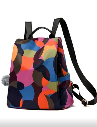 Mochila con un diseño moderno y llamativo, perfecta para el día a día. - Estampado de círculos en múltiples colores. - Material impermeable. - Diseño antirrobo. - No incluye el pompón Me la compré y me regalaron otra igual, está empaquetada según me vino
