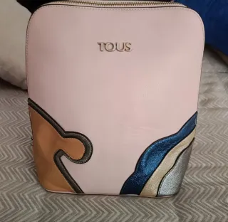 Mochila de la marca Tous con un diseño llamativo. - Color principal rosa. - Detalles en tonos marrón, azul, dorado y plateado. - Logo de la marca Tous en la parte frontal.