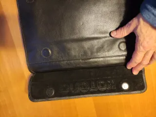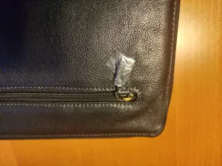 Elegante portafolios de piel con un diseño clásico. - Material: Piel genuina. - Color: Negro y marrón. - Cierre de cremallera. - Bolsillo exterior con cremallera.