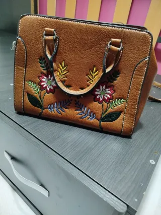 Elegante bolso de mano en tono marrón, adornado con un delicado bordado floral multicolor. - Diseño con asas superiores. - Detalles bordados de flores y hojas. - Acabado texturizado.