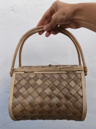 Bolso artesanal hecho con fibras naturales tejidas. Su diseño combina tonos beige y marrones, aportando un toque rústico y elegante. - Material: Fibras naturales y madera. - Cierre con cuerda y espiga de madera.