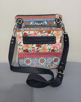 Bolso bandolera con un vibrante estampado floral y detalles geométricos. Bolso desigual 29x24 - Correa ajustable para mayor comodidad. - Cierre de cremallera principal.