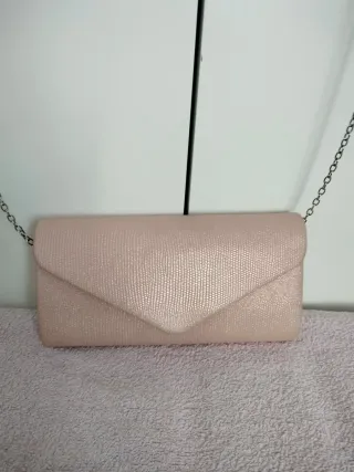 Elegante bolso de mano con un diseño texturizado que combina tonos dorados y rosados. Perfecto para complementar tu atuendo en ocasiones especiales. - Diseño tipo sobre. - Cadena metálica para llevar al hombro.