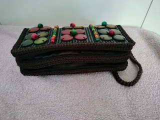Elegante bolso de mano con un diseño único. - Decorado con apliques de flores y cuentas. - Cierre de cremallera. - Asa tejida para llevar cómodamente.