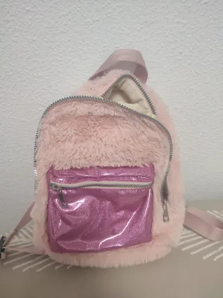 Bolso de peluche suave en color rosa, con un bolsillo frontal brillante de purpurina. - Material exterior de pelo sintético. - Bolsillo frontal con cremallera y acabado de purpurina. - Cierre principal con cremallera. Es mochila también. Prácticamente nuevo. Ideal para regalo