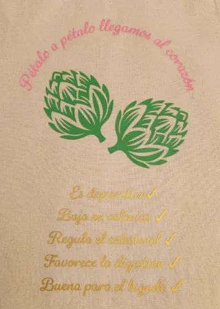 Bolsa tote bag con un diseño original de alcachofas y texto inspirador. - Diseño Pétalo a pétalo llegamos al corazón. - Beneficios de la alcachofa: depurativa, baja en calorías, regula el colesterol, favorece la digestión y es buena para el hígado. - Asas cómodas para llevarla al hombro.