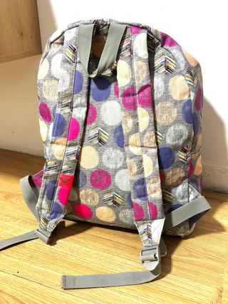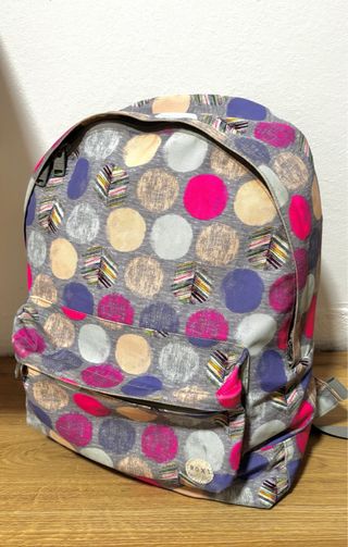 Mochila con estampado de círculos y detalles de hojas. - Diseño multicolor. - Cierre de cremallera principal con doble cremallera. - Bolsillo frontal con cremallera. - Etiqueta de la marca ROXY. En el interior se nota algo de desgaste, pero por fuera está como nueva.