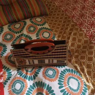 Bolso de mano con un diseño tejido y asas de madera. - Material: tejido - Color: marrón y morado - Asas de madera