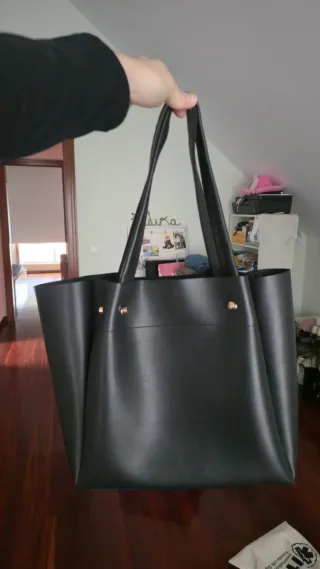 Bolso grande de color negro, con un diseño moderno y espacioso. Perfecto para el día a día. - Material: Polipiel. - Cierre: Magnético. - Dos asas para llevar al hombro. - Detalle de remaches dorados.