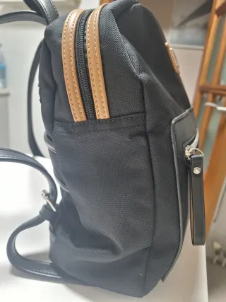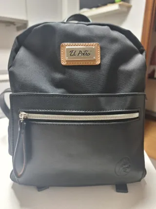 Mochila de la marca El Potro, combinando piel y nylon. - Diseño elegante en color negro. - Detalle de placa metálica con el logo de la marca. - Bolsillo frontal con cremallera. - Asa y tirantes de piel.