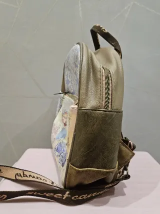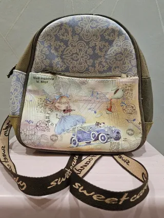 Bolso mochila con un diseño único y llamativo. - Estampado frontal con escena vintage. - Detalles de encaje y texto. - Tacto tipo cuero. - Medidas: 23cm de alto, 24 cm de ancho y 10 cm de fondo.