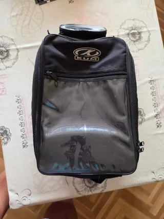 Mochila de moto de la marca KUM en color negro. Cuenta con un compartimento principal y una ventana transparente en la parte frontal. - Compartimento principal con cremallera. - Ventana transparente frontal. - Expandible, entra dentro un casco integral. - Es universal ya que se adhiere con imanes.