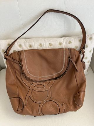 Bolso de piel en color camel de la marca Purificación García. Un diseño elegante y versátil. - Material: Piel. - Color: Camel. - Diseño con apliques. - Cierre de cremallera. - El bolso está usado pero bien conservado. Solo tiene un tramo de cremallera descosido y aunque cierra, se ve el defecto. (Mirar última foto). Por eso lo vendo tan económico.