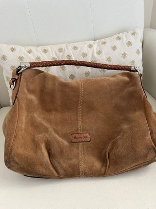 Bolso de ante de Massimo Dutti. - Color marrón camel - Asa trenzada. - Cierre de solapa.
