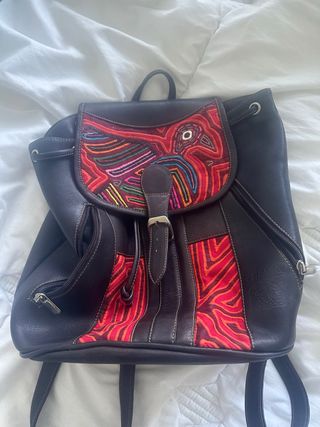 Mochila de cuero con un vibrante diseño artesanal inspirado en la cultura Mola colombiana. Perfecta para añadir un toque único a tu estilo. - Elaborada en cuero. - Detalles bordados coloridos. - Cierre de solapa con hebilla. - Bolsillos laterales con cremallera.