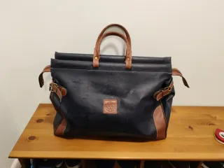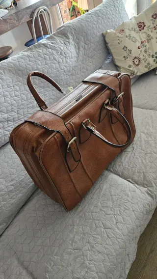 Práctica bolsa de viaje de gran capacidad, perfecta para escapadas, Cierre cremallera y hebillas laterales. Tipo maletin médico antiguo. Iniciales BW. Mucha cabida. Medidas 35 cm alto x 54 cm ancho ensanchable por hebillas lados x 25 cm ancho.