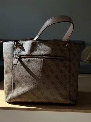 Bolso grande de la marca Guess con un diseño elegante. - Color marrón con detalles dorados. - Estampado de monograma característico de la marca. - Incluye charm con el logo de Guess.
