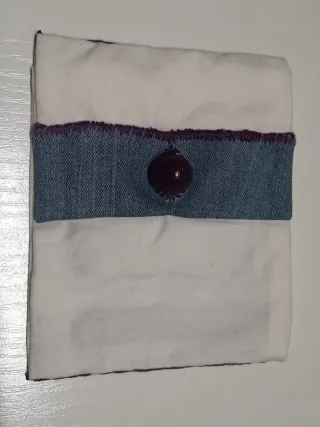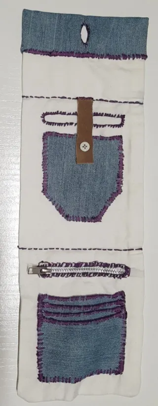 Carteras hechas a mano con un diseño único. - Costuras visibles en contraste. - Cierre de cremallera. - Bolsillos exteriores. - Detalle de botón y tira de cuero.