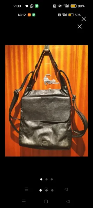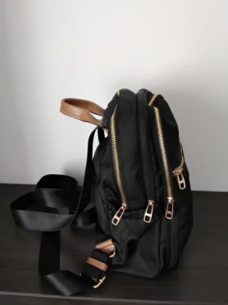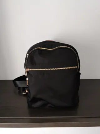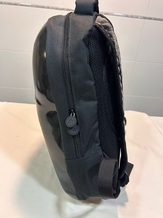 Mochila mediana de polipiel con un diseño moderno. - Compartimento principal con cierre de cremallera. - Bolsillo frontal con cremallera. - Asas ajustables. - Detalle de logo en placa metálica. El parche se lo puse yo costo el doble